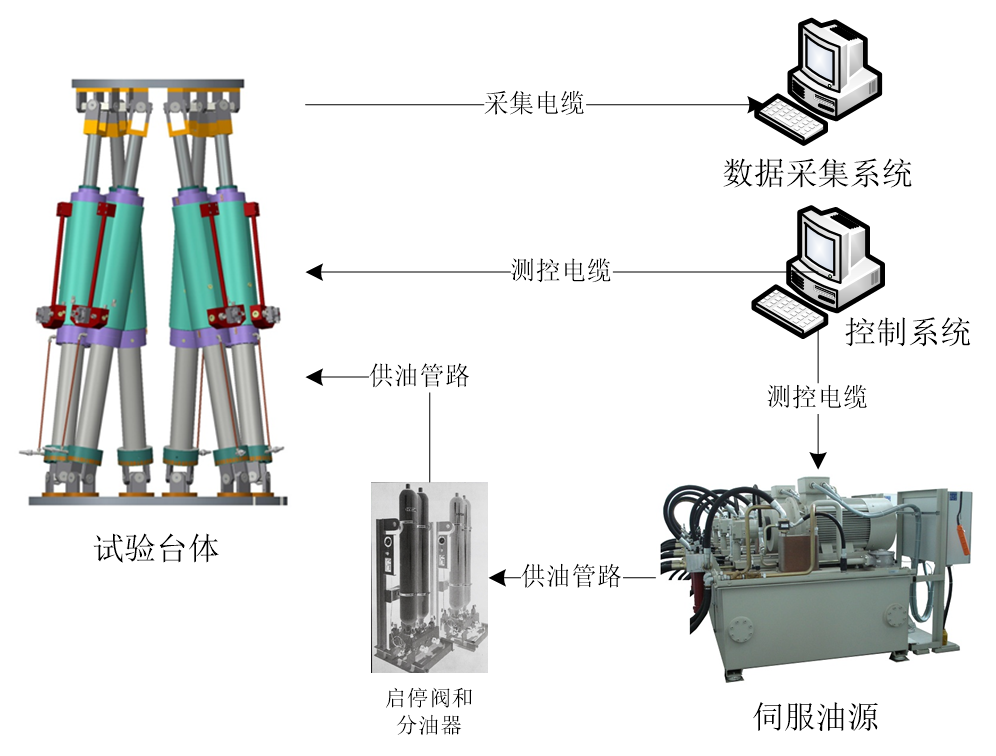 液壓搖擺臺(tái)由試驗(yàn)臺(tái)體、控制系統(tǒng)、伺服油源、子站和數(shù)據(jù)采集系統(tǒng)等主要部分組成。其中,試驗(yàn)臺(tái)體是由6臺(tái)作動(dòng)器組成的六自由度運(yùn)動(dòng)平臺(tái),用于實(shí)現(xiàn)試驗(yàn)件的單自由度正弦運(yùn)動(dòng)或多自由度復(fù)合正弦運(yùn)動(dòng)。控制系統(tǒng)控制試驗(yàn)臺(tái)體或者單個(gè)作動(dòng)器按指令運(yùn)動(dòng)。伺服油源為系統(tǒng)運(yùn)動(dòng)提供動(dòng)力。啟停閥用于控制伺服油源動(dòng)力的通斷。分油器將油液輸送到試驗(yàn)臺(tái)體的各執(zhí)行機(jī)構(gòu)中。數(shù)據(jù)采集系統(tǒng)采集存儲(chǔ)試驗(yàn)數(shù)據(jù)。